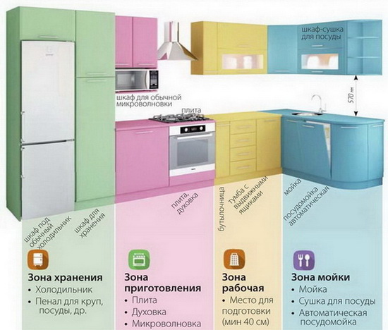 - мойка и посудомоечная машина — рядом с коммуникациями;