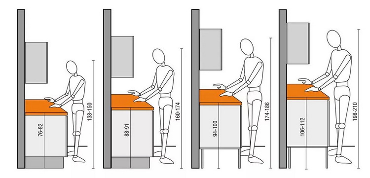Классическая высота нижних шкафов — 85 см вместе со столешницей. Однако она может варьироваться под рост хозяев. Оптимально, когда при работе за столешницей спина остаётся прямой. Верхний ярус обычно располагается на высоте 50–60 см от столешницы. Глубину шкафов также стоит рассчитать: слишком широкие полки неудобны, слишком узкие — не вместят нужное.